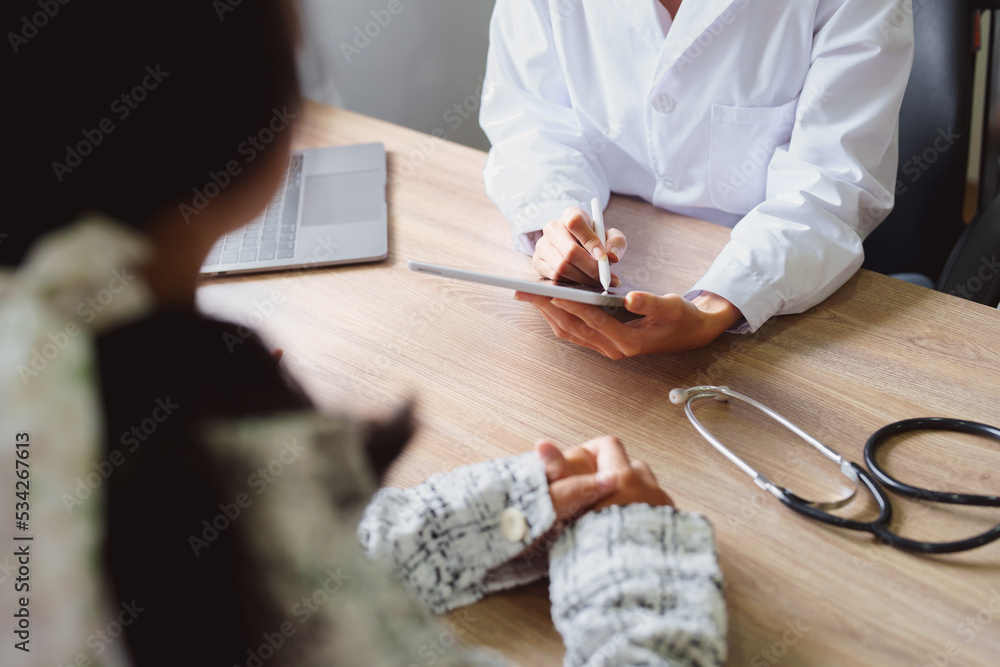 Portrait of a doctor advising clients on health issues holding a tablet to work and talking to patients who come to treatment #534267613