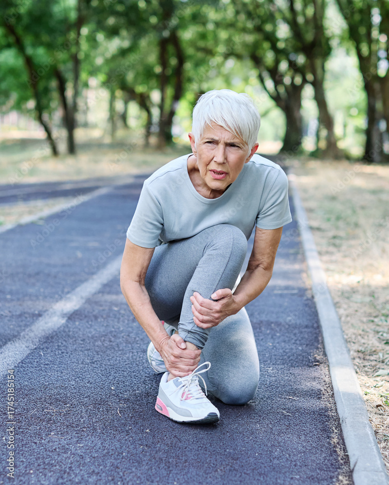 Portrait of a mature middle aged sport woman sitting with a leg injury in pain, after running or exercising in city park outdoors #1745185154