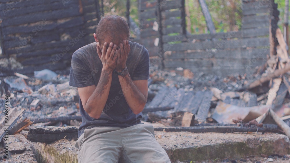 Portrait of a sad man on the background of a burned house, after fire . Consequences of fire disaster accident. Ruins after fire disaster, despair concept. #276877532