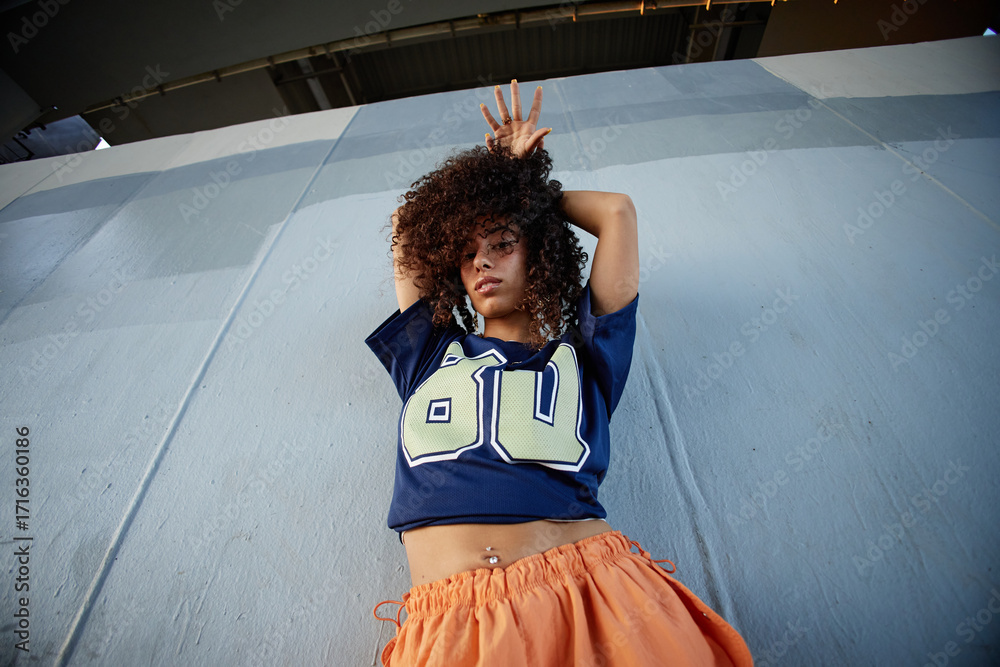 Portrait of girl standing against urban wall, raising arms above head, looking directly at camera, wearing casual clothing, expressing confident attitude #1716360186