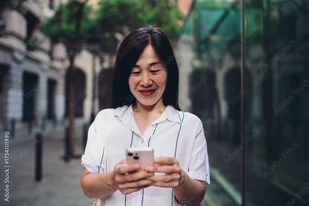 Portrait of woman looking at smartphone with subtle smile, capturing gentle emotional connection, digital mindfulness and the intimacy of mobile interaction in urban everyday. #1734101990