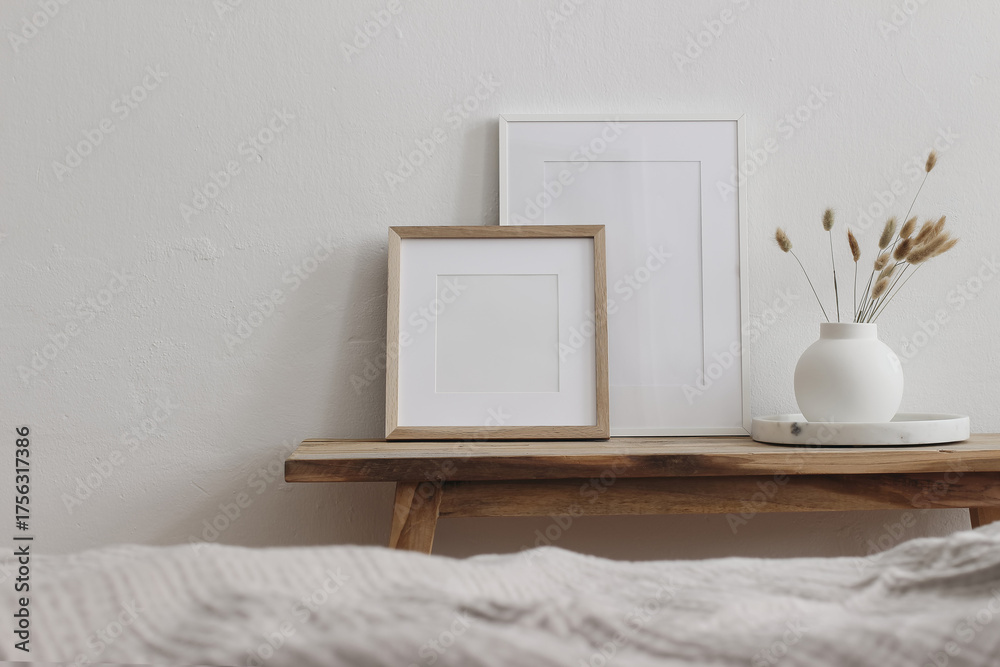 Portrait, square wooden and white frame mockups on vintage wooden bench, table. Modern white ceramic vase, dry Lagurus ovatus grass on marble tray. Blurred beige linen blanket. Scandinavian interior. #1756317386