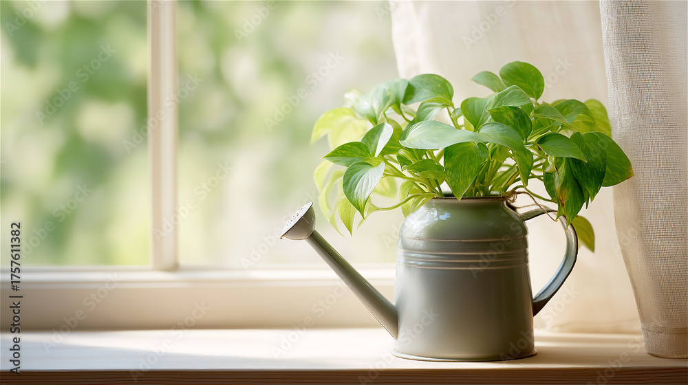 Potted green plant near bright window in natural sunlight, concept of home decor, nature and sustainable living. #1757611382