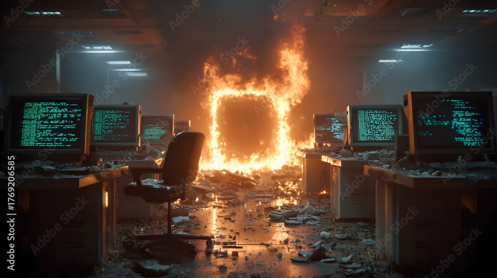 Powerful, dramatic photograph of a modern office in chaos, with computers and desks engulfed in flames, lines of glowing green code still visible. #1769206585