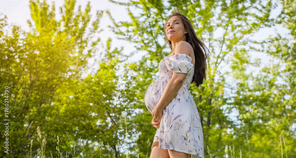 Pregnant woman holding showing belly baby bump smiling happy in 3rd trimester in spring forest nature. Asian expectant mom holding tummy. #1780214790
