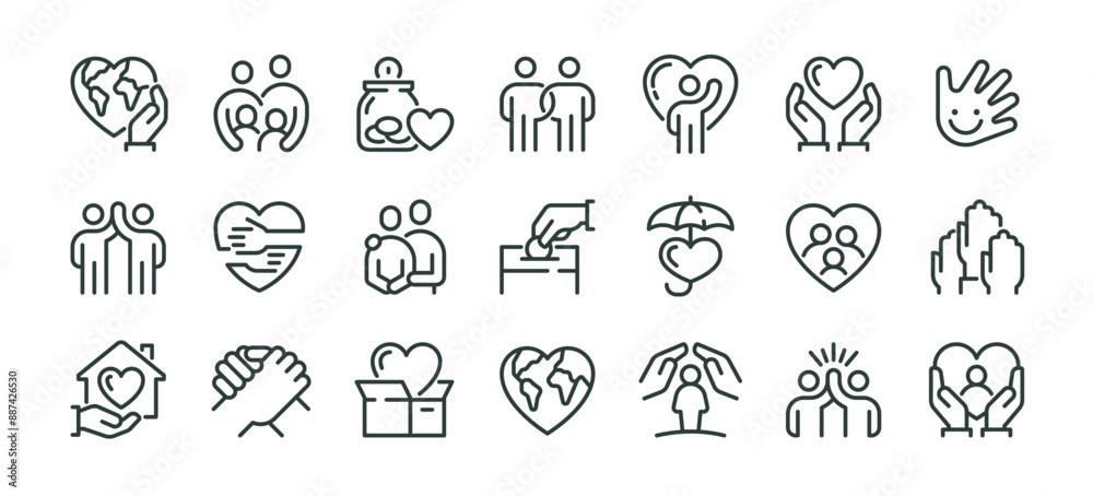 Premium Icons Pack on Human Care and Charity. Such Line Signs as Volunteering and Social Help, Support Kindness and Friendly Relations. Vector Icons Set for Web and App Outline Editable Stroke. #887426530