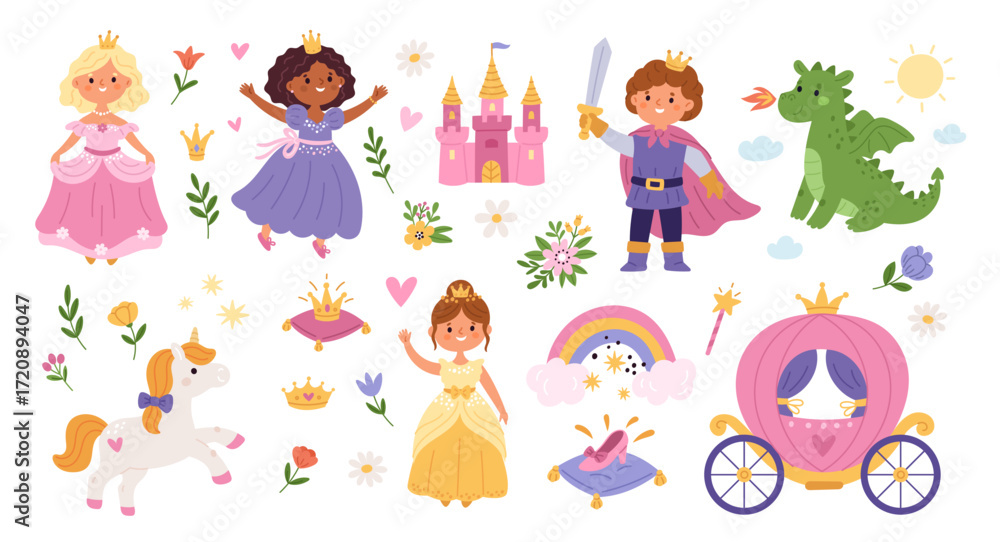 Princess and royal accessories. Pretty girls in puffy dresses, cute prince with sword, magic castle, fairy tale dragon and unicorn, vector cartoon flat style isolated garish vector set #1720894047