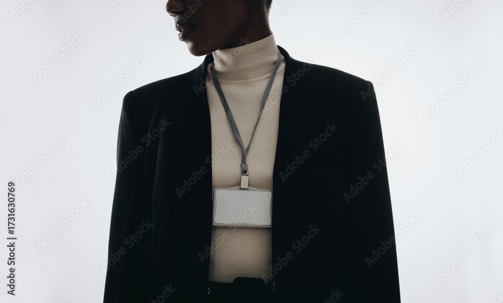 Professional wearing blank lanyard badge for corporate and event mockups #1731630769