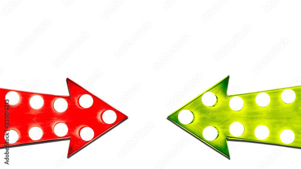 Pros and cons red and green leaf right vintage retro arrows illuminated with light bulbs. Concept image for advantages and disadvantages, risk and opportunity. Isolated on white background. #233194213