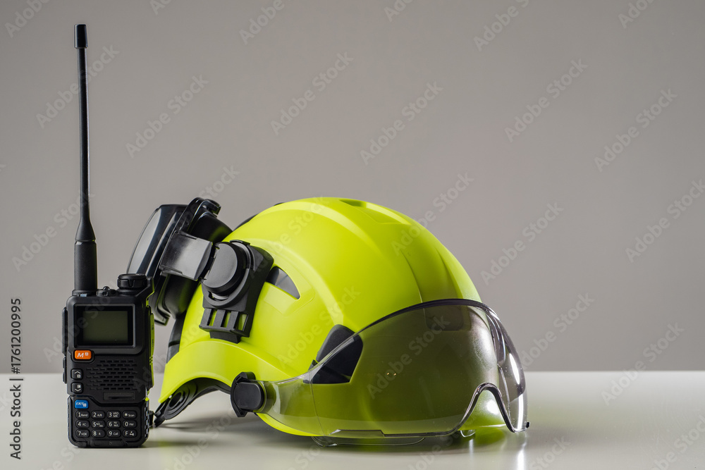 Protective helmet. Firefighter hardhat with goggles. Industrial worker radio and headgear. Protective helmet for factory workers. Yellow hardhat for working in hazardous areas. Rescue worker helmet. #1761200995