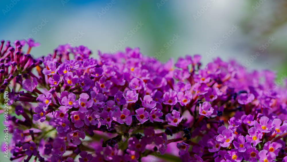 Purple Buddleja Davidii flower against a blue sky background close-up. #1940253520