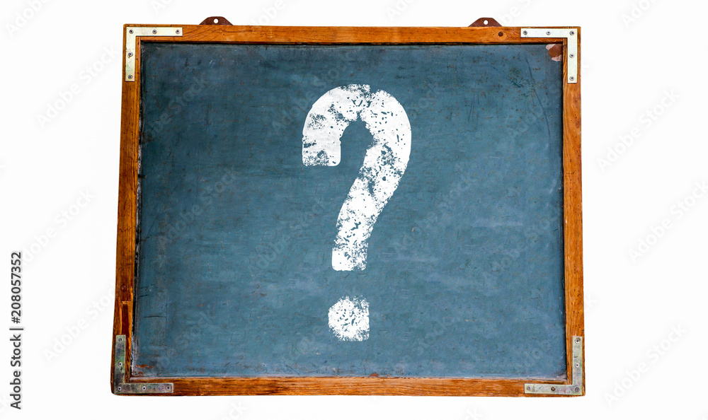 Question mark white sign on a blue old grungy vintage wooden chalkboard or retro blackboard with weathered frame and isolated on seamless white background. #208057352