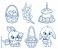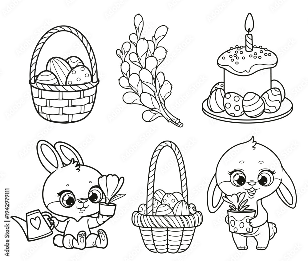 Rabbits, willow branches, Easter cake, baskets with Easter eggs outlined for coloring on a white background #1942979111