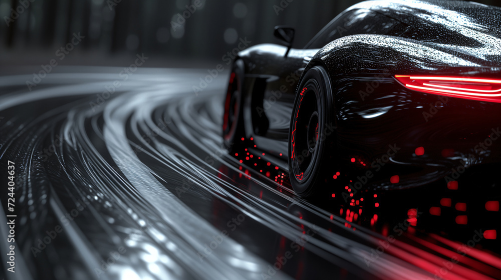 Racing sports car on neon highway. Powerful acceleration of a supercar on a night track with colorful lights and tracks. Blur at high speed. The light trail from the headlights. #724404637