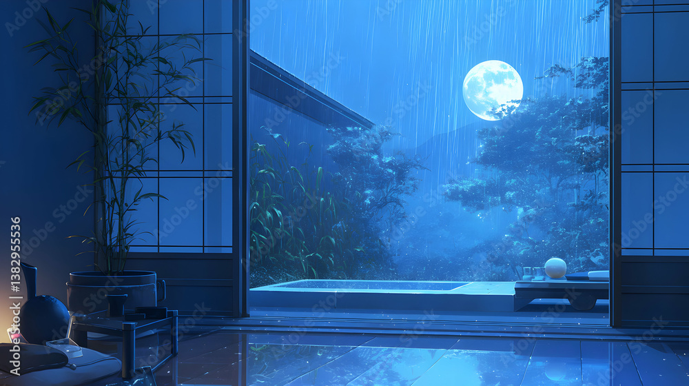 Rainy Night Zen Garden Illustration #1382955536
