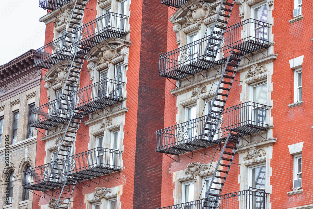 Red brick facade, and fire stairs. Harlem, NYC. #285510905