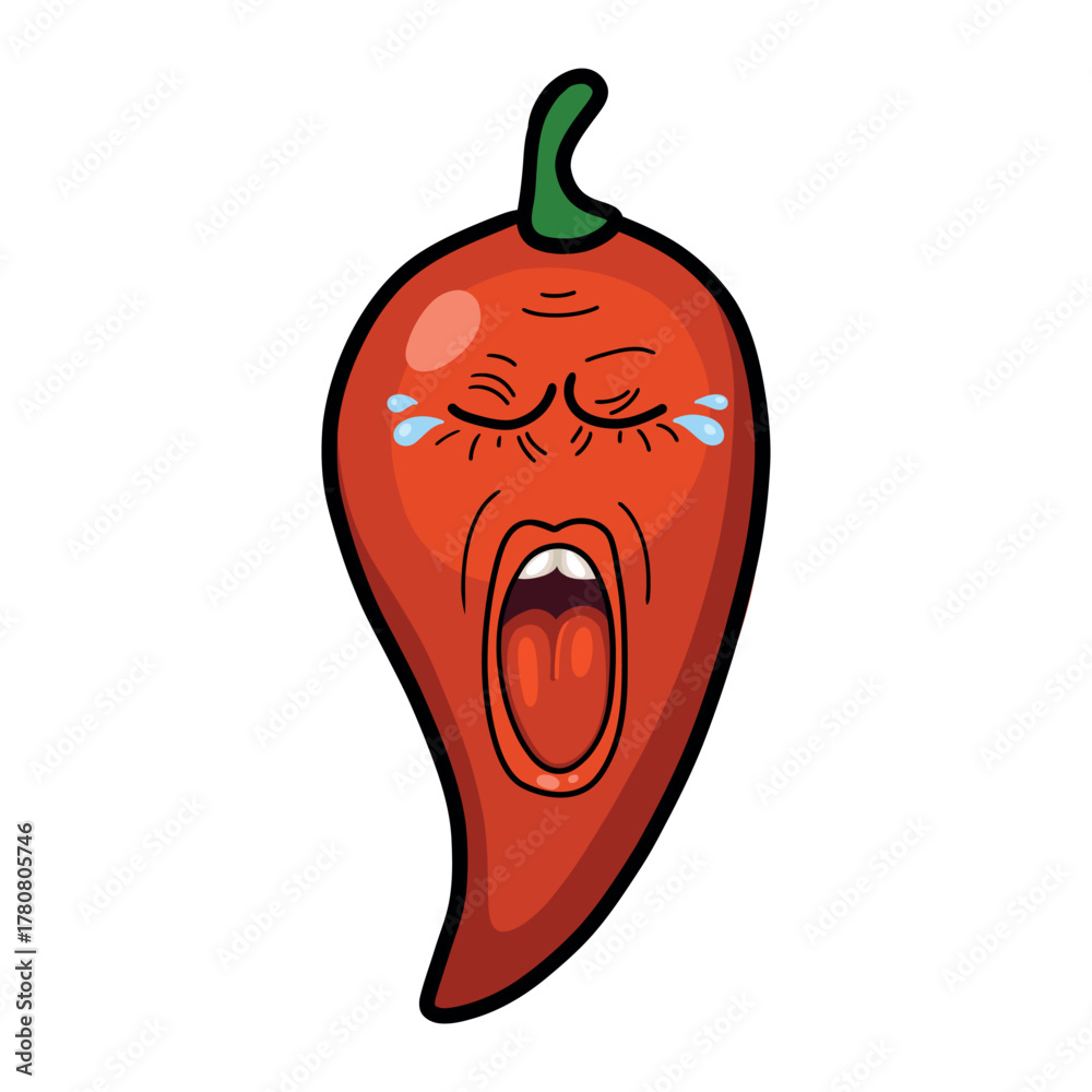 Red hot pepper on white background. Red hot pepper with a face. The emotion of spiciness. Closed eyes and open mouth. Shortness of breath. Chili with spiciness face mascot logo. Cartoon flat style. #1780805746