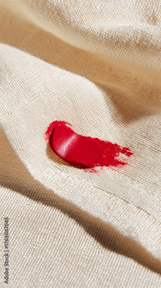 Red lipstick mark on white fabric surface, concept of beauty, sensuality, and detail in everyday moments. #1765047045