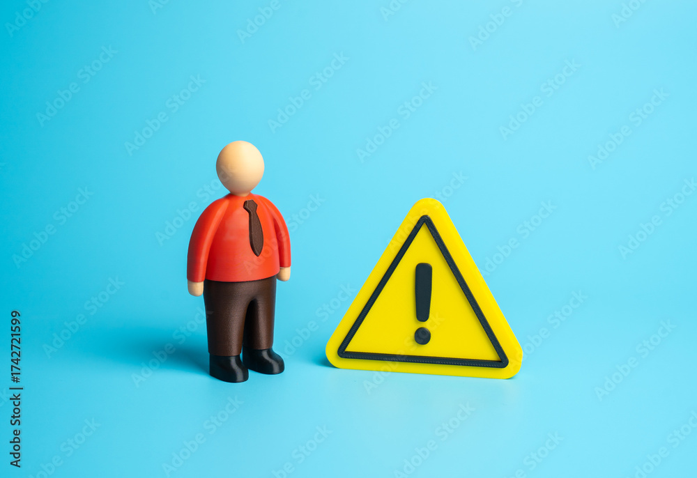 Red office employee and sign of attention. Issuing a warning. Violation of discipline. Labor shortage. Concept for HR control, corporate ethics, and workplace problems. #1742721599