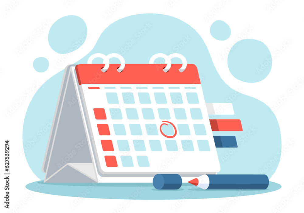 Red pen marks the date, holiday, priority, important, reminder day on calendar concept on blue background. Vector illustration flat design for banner and poster. #627539294