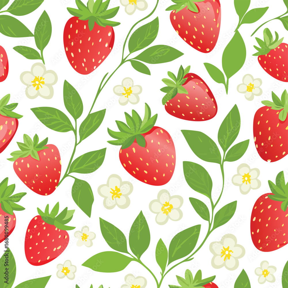 Red strawberries and green leaves seamless pattern with white flowers strawberry fruit #1680099485