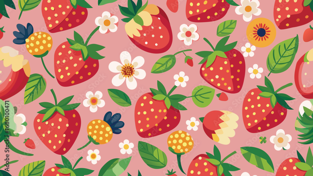 Red strawberries white flowers and green leaves seamless pattern on pink background #1680100471