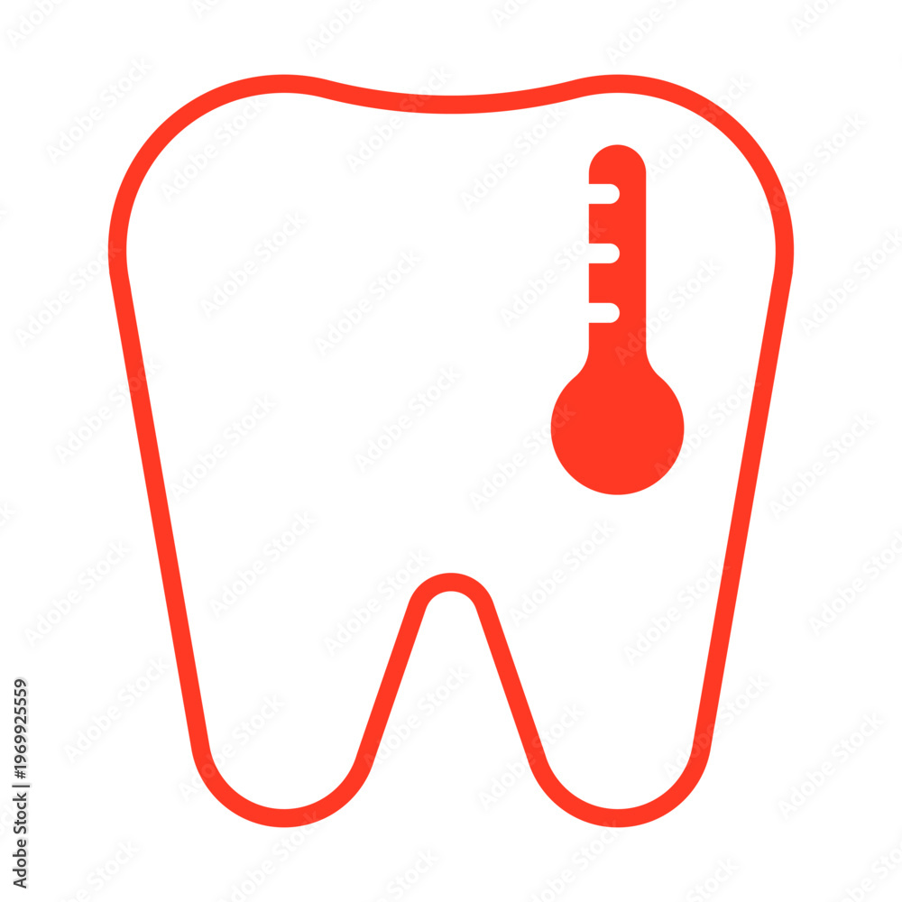 Red tooth icon with thermometer showing dental pain or fever. Dentistry symbol representing oral health issues, toothache or sensitivity. Clinical dental care, hygiene and symptom theme. Vector #1969925559