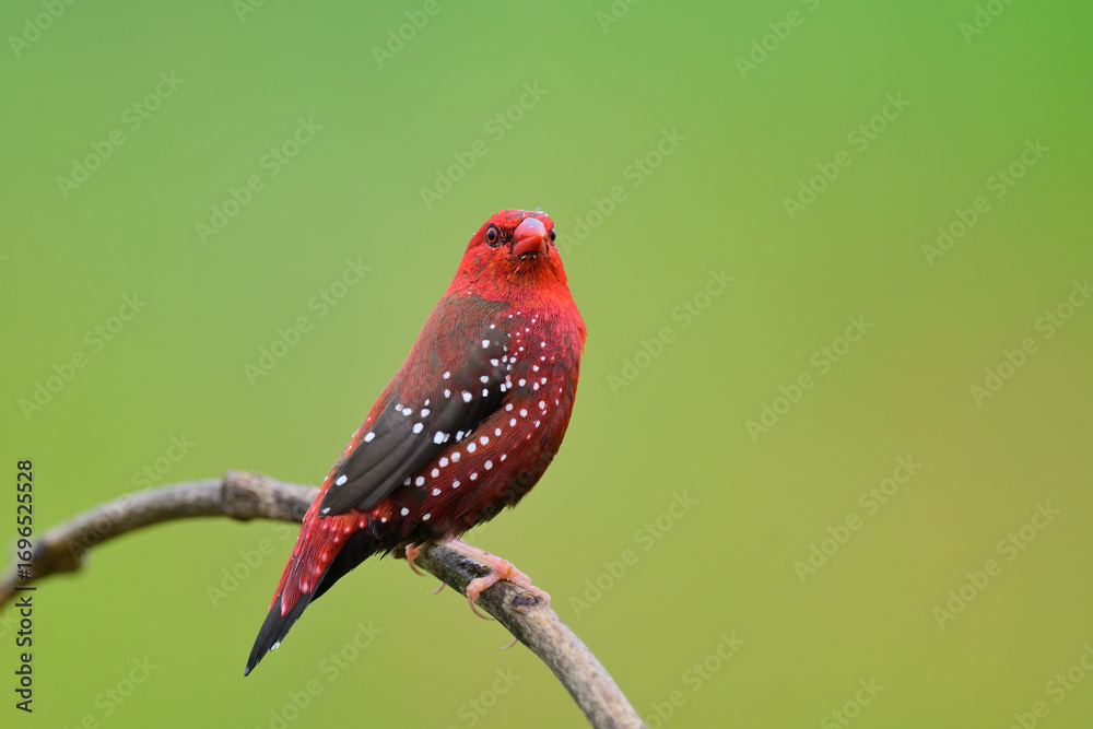 red with white spots bird proudly perching on wooden stick with rain drops on its head,, male of strawberry finch or red avadavat #1696525528