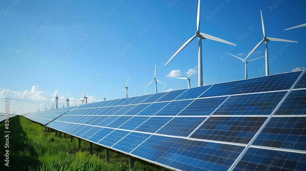 Renewable Energy Farm: On a vast renewable energy farm, rows of solar panels and wind turbines generate clean energy, providing a sustainable alternative to fossil fuels #836955572