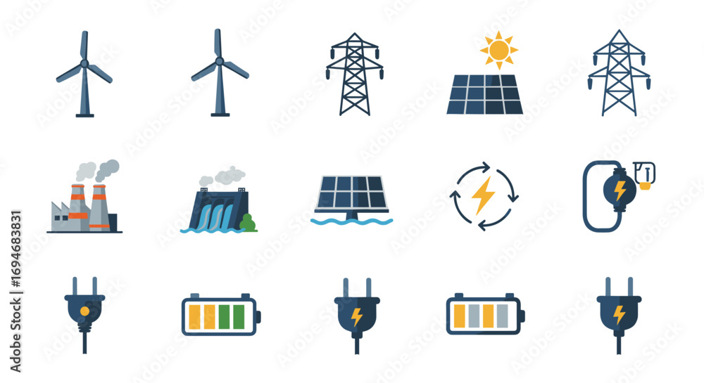 Renewable energy icons: wind turbines, solar panels, and power generation #1694683831