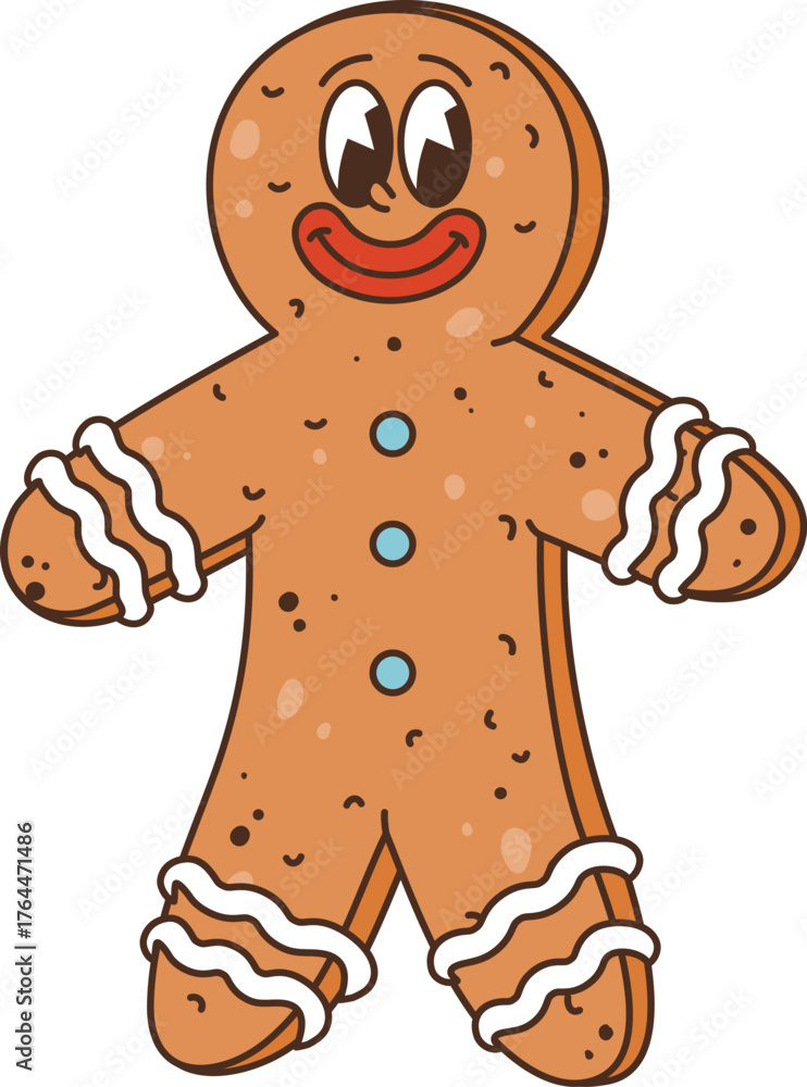 Retro cartoon groovy Christmas vector gingerbread mascot. Cute gingerbread cookie character with sparkling eyes, wide red smile and icing trims. Isolated vector happy xmas dessert pastry personage #1764471486