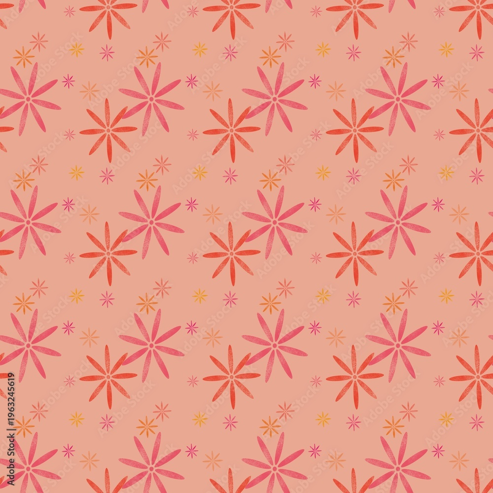 Retro naive daisy seamless pattern on terracotta pink background. Mid-century modern style flower print for textiles and wallpaper. #1963245619