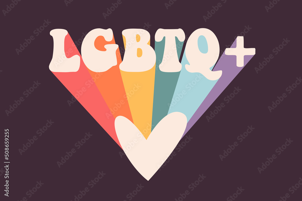 Retro poster with "LGBTQ+" slogan with heart and hippie rainbow sunshine on background. Vector LGBT rainbow print for t-shirt, sticker, poster. #508659255