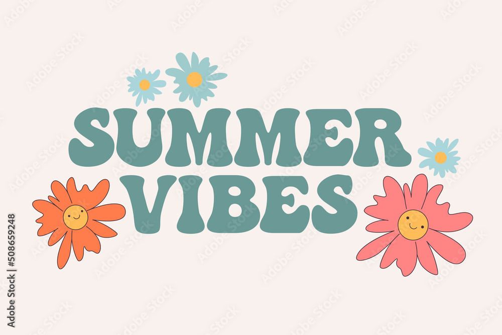 Retro poster with "Summer vibes" slogan in retro colors with vintage daisy flowers. Vector print for t-shirt, sticker, poster. #508659248