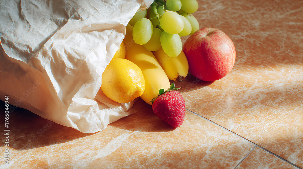 Reusable paper bag with fruits on kitchen floor, concept of healthy eating, sustainability and eco lifestyle. #1765046941
