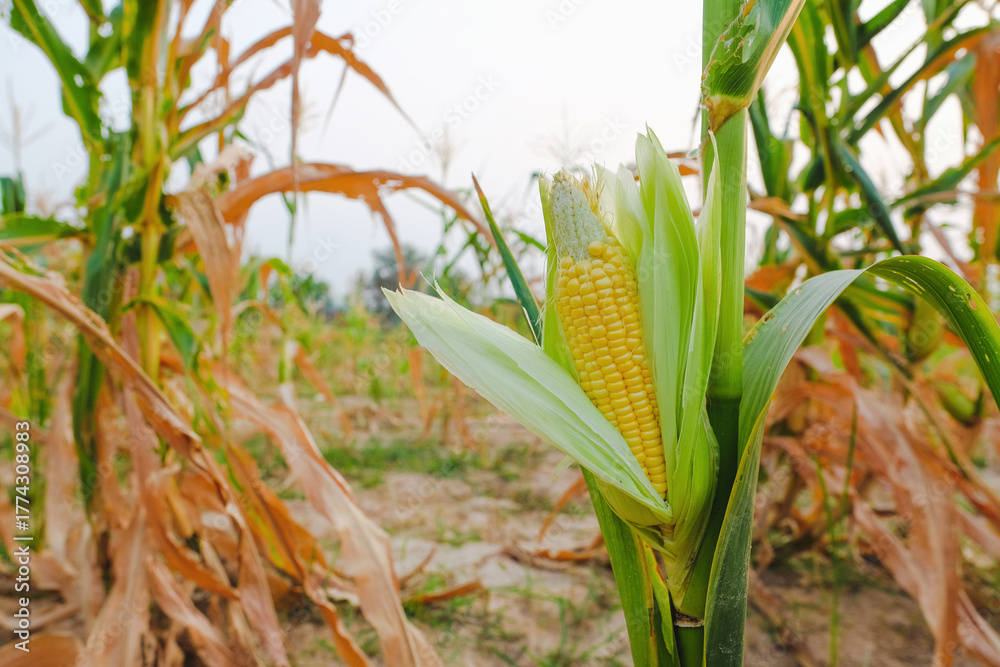 Ripe maize cobs in a lush green field during summer season. #1774308983