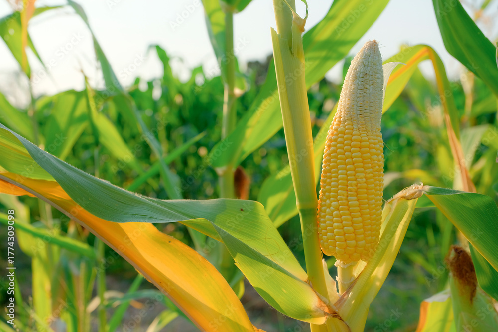 Ripe maize cobs in a lush green field during summer season. #1774309098