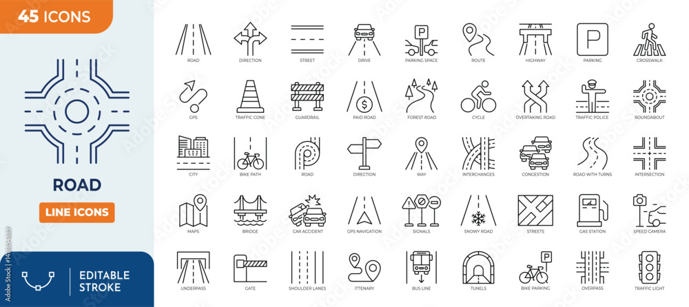 Road icons set. Containing street, highway, traffic light, signpost, parking, route, drive, crosswalk, roundabout, and more. Outline Icon Collection. Vector illustration. Editable stroke #1418854889