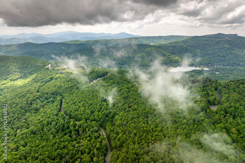 Road trip driving in Tennessee Appalachian mountains. Winding parkway in mountain forest with green canopies in summer rain season #1722438572
