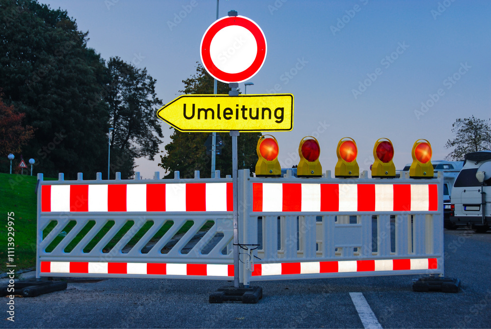 Roadworks illuminated by headlights at dusk with detour signs and flashing lights. - 2338 #1113929975
