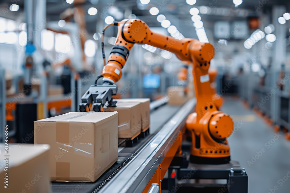 Robot arms in a warehouse preparing boxes for delivery on a conveyor belt. #812353855