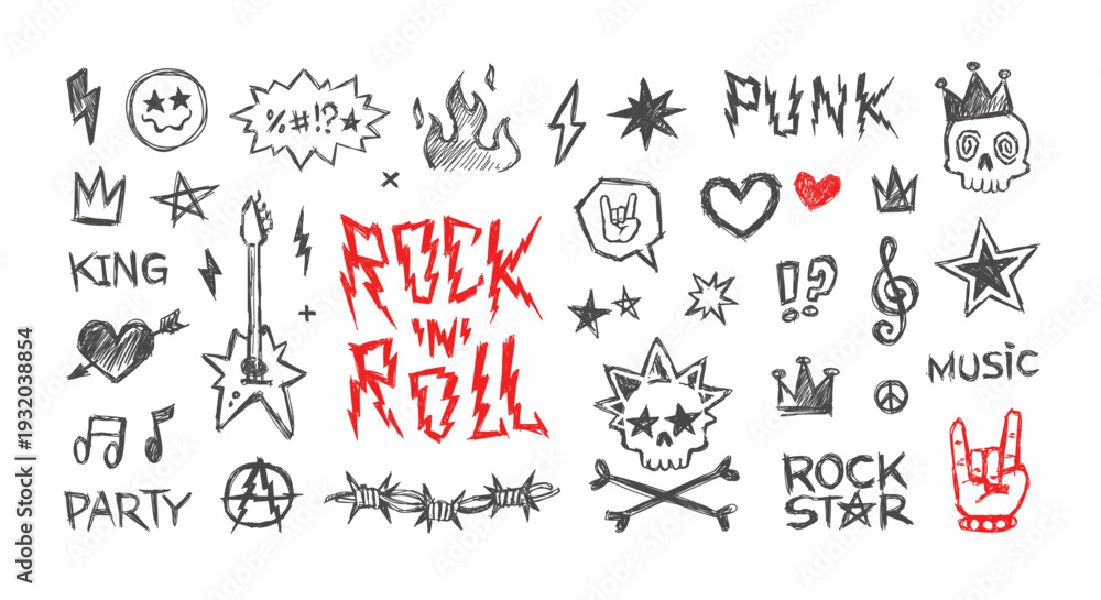 Rock'n'Roll music and Punk doodle signs, Hand dawn pattern elements in scribble grunge style - editable vector ( part 2 ) #1932038854
