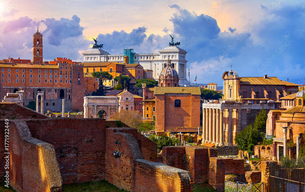 Roman Forum in Rome, Italy. Antique structures with columns. Wrecks of ancient italian roman town. Sunrise above famous architectural landmark by the Capitoline Hill. Dramatic sky. #1771922449