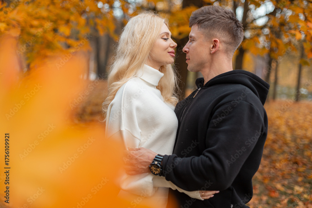 Romantic couple embracing in an autumn park surrounded by golden leaves. Warm and tender moment of love and affection outdoors during the fall season. #1756109921