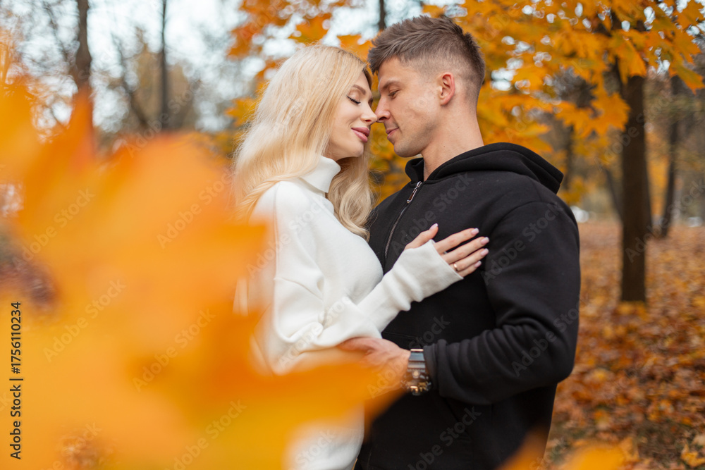 Romantic couple embracing in an autumn park, surrounded by golden leaves. Warm fall colors, love and tenderness in a beautiful outdoor setting. #1756110234