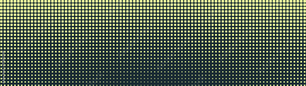 Rounded square particles grid halftone pattern faded texture ultra wide 32:9 aspect ratio vector vibrant yellow black high contrast abstract background. Half tone ultrawide retro styled futuristic bg #1758422591