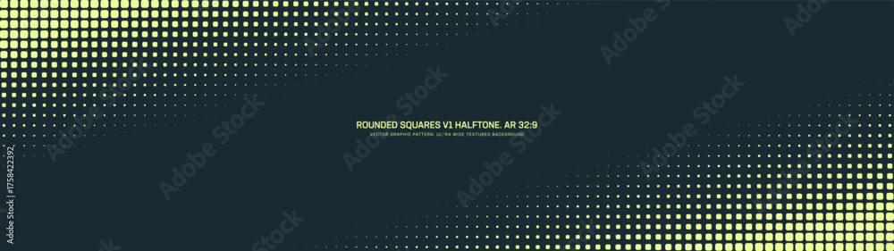Rounded squares grid halftone pattern faded tilted diagonal border ultra wide 32:9 aspect ratio vector yellow black contrast abstract background. Half tone ultrawide format futuristic tech abstraction #1758422392