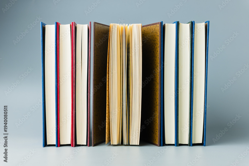 Row of colorful hardcover books with one open book in the center on minimal background #1940080511