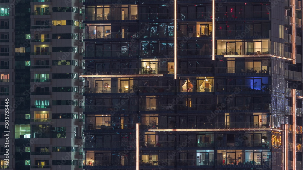Rows of glowing windows with people in apartment building at night. #305733445