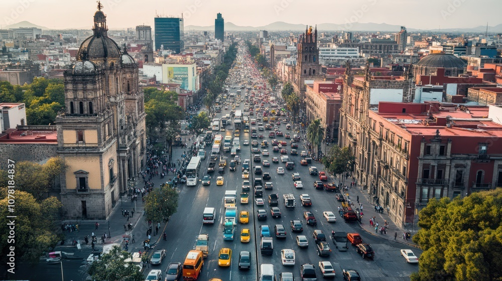 Rush hour traffic in Mexico City. Mexico. vehicles at a standstill on major roads. dense atmosphere. #1078184837